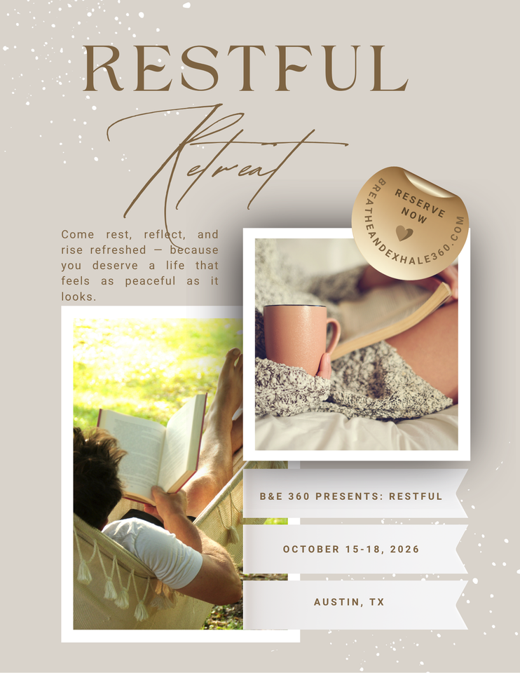 Restful Retreat, presented by Breathe & Exhale 360, will be held from October 15th to 18th, 2026, in Austin, TX! Restful Retreat includes: Lodging, Meals, Transportation, Group and Individual Workshops, Dinner, AND much more!